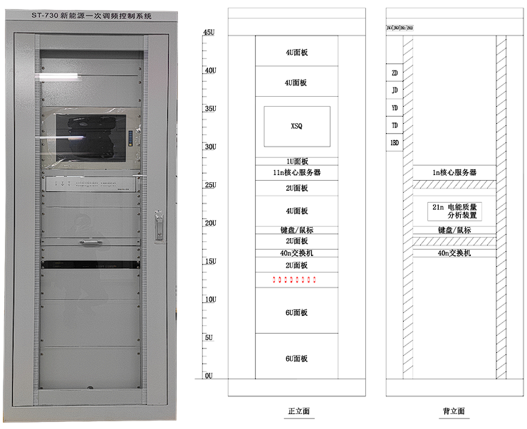 ST-730采用800*600*2200标准控制柜方式安装,电源支持AC/DC 220V/110V 50~60Hz单电源/冗余电源可选(失电告警);内置一台QTouch-3200一次调频核心服务,操作系统采用实时Linux系统,搭载最新的QTouch自主可控跨平台组态软件V3.0版本,具备IEC60870、IEC61850、Modbus、OPC等众多通讯接口,具有强大的逻辑编程能力,可以自定义控制策略和自动控制方式。