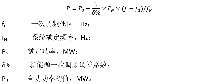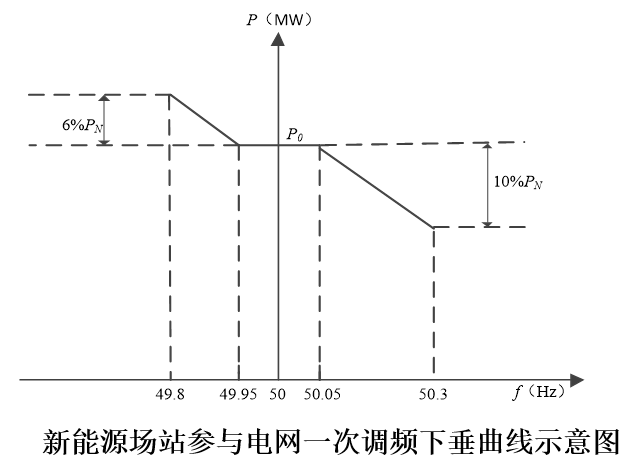 仿照常规电源机组一次调频功能,在新能源场站有功控制系统中实现有功-频率下垂特性控制,实现新能源参与电网快速频率响应功能。具体功能如下: