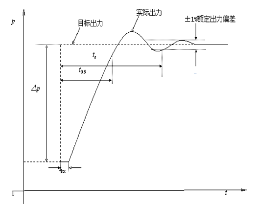 响应时间t0.9:自频率超出调频死区开始,至有功功率调节量达到调频目标值与初始功率之差的90%所需时间。